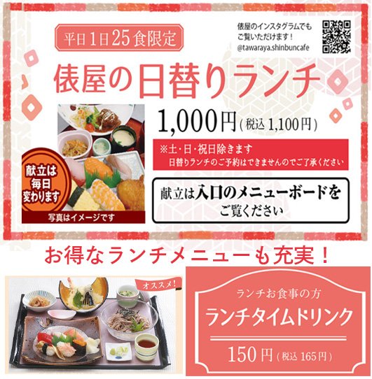 一日25食限定の日替わりランチや、お寿司とおそばが両方楽しめる「そばランチ」、季節によってネタが変わる「にぎりランチ」、他にも天丼ランチ、PIZZAランチなど、俵屋のランチメニューはバラエティ!お得なランチドリンクも好評です♪